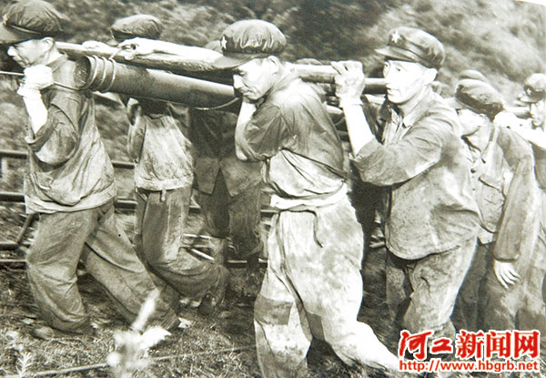 ■戰(zhàn)士們在抗美援越前線運送鋼管等物資