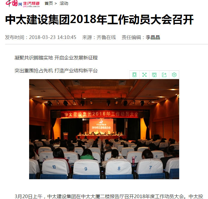中國網報道了“中太建設集團2018年工作動員大會召開”