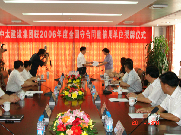 中太建設集團獲2006年度全國守合同重信用單位授牌儀式于2007年8月20日在中太大廈十六樓會議室舉行。河北省工商行政管理局受國家工商行政管理總局的委托,向中太建設集團授予獎牌。
