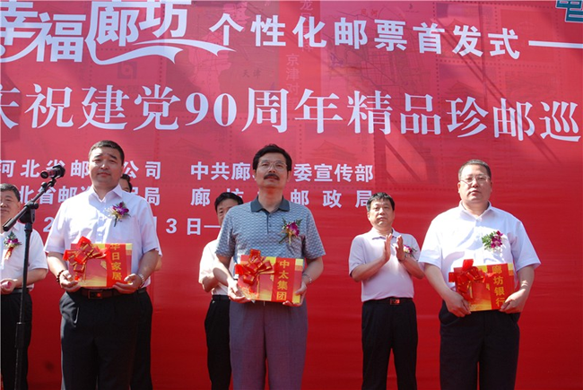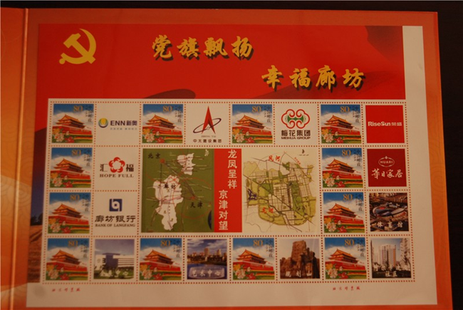 6月3日上午,由廊坊市委宣傳部與廊坊市郵政局共同推出的《黨旗飄揚(yáng) 幸福廊坊》個(gè)性化郵票在廊坊市博物館舉行首發(fā)式。《黨旗飄揚(yáng)·幸福廊坊》個(gè)性化郵票共“1+12”幅圖案。“1”即中心主圖案,體現(xiàn)廊坊市“龍鳳呈祥,京津?qū)ν钡膮^(qū)位優(yōu)勢,“12”即12幅輔圖,其中4幅分別為會展中心、居民小區(qū)、文化藝術(shù)中心、中央生態(tài)城,體現(xiàn)“智能、生態(tài)、商務(wù)、休閑”的廊坊城市定位,中太建設(shè)集團(tuán)作為品牌企業(yè)參與了此次個(gè)性化郵票的征集和制作。