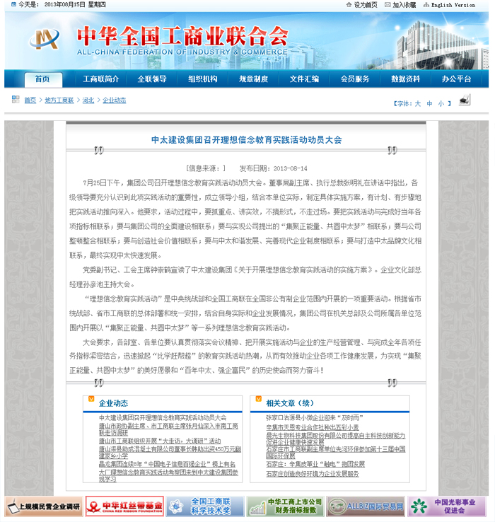 全國工商聯(lián)網(wǎng)站8月14日報道了中太建設集團召開理想信念教育實踐活動動員大會