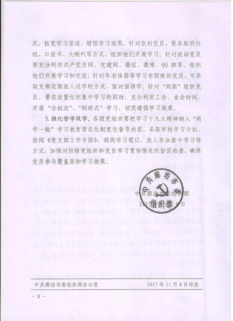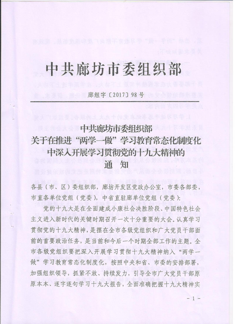 [2017]24號關于轉發(fā)《中共廊坊市委組織部<關于在推進“兩學一做”學習教育常態(tài)化制度化中深入開展學習貫徹黨的十九大精神的通知>》的通知