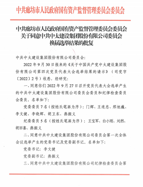 現(xiàn)將《中共廊坊市國(guó)有資產(chǎn)監(jiān)督管理委員會(huì)委員會(huì)關(guān)于同意中共中太建設(shè)集團(tuán)股份有限公司委員會(huì)換屆選舉結(jié)果的批復(fù)》轉(zhuǎn)發(fā)給你們,請(qǐng)及時(shí)傳達(dá)至全體黨員。